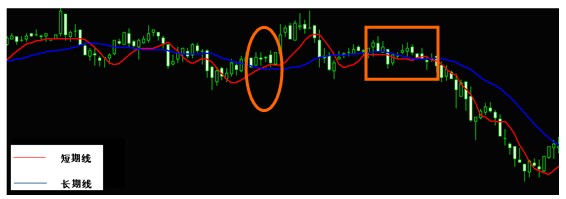 这时买卖的原则仍然可以使用葛氏法则,即短期均线上穿中期均线时形成金叉是买入时机;短期均线下穿中期均线时形成死叉是卖出时机。